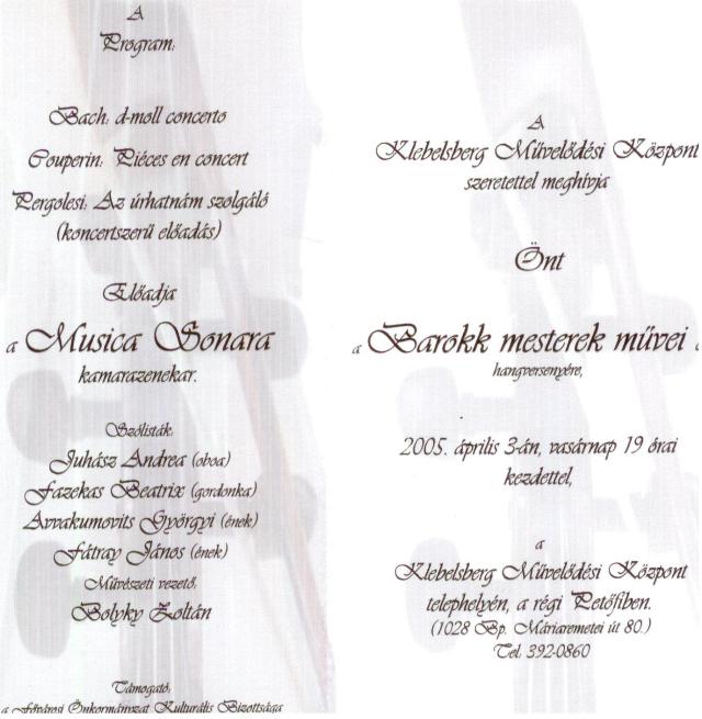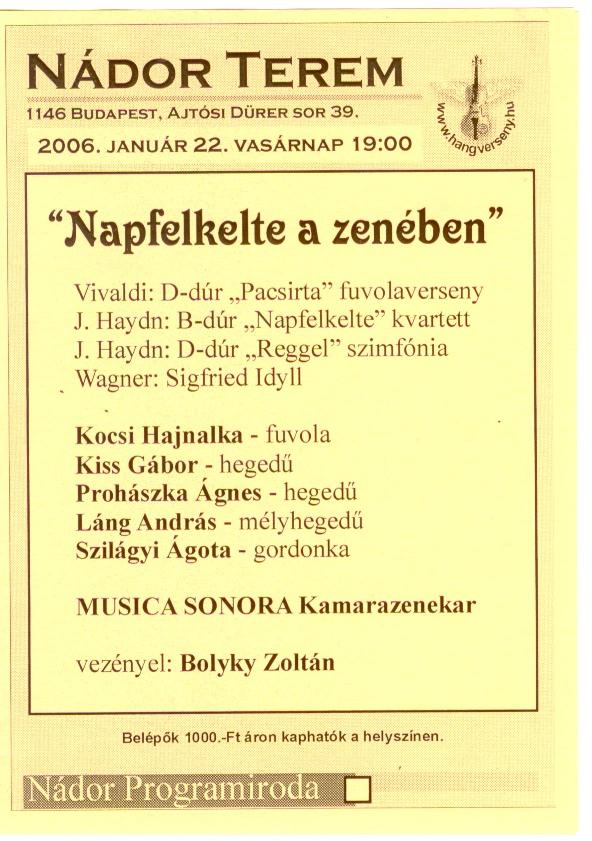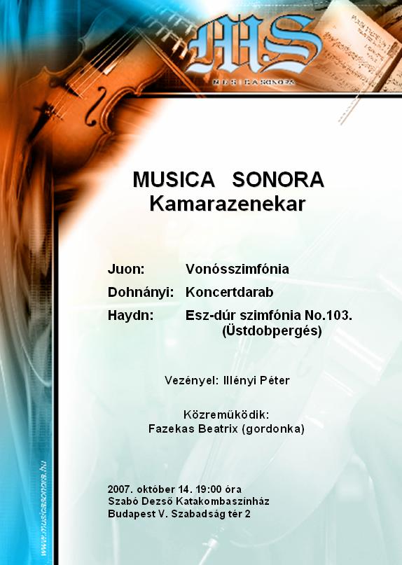 Közzétette: Gábor (2008, Április 1 - 23:21)2008. április 26-án, szombaton, a Szabó Dezső Katakombaszínházban a Musica Sonora Kamarazenekar koncertet rendez.